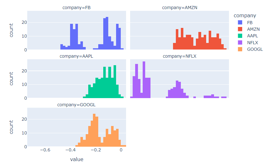 px.histogram(df_ratio, nbins=50, facet_col="company", facet_col_wrap=2)