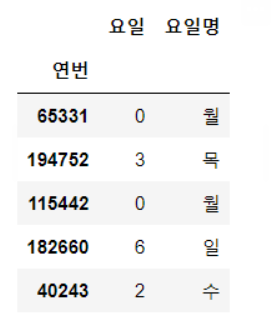 df[["요일","요일명"]].sample(5)