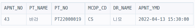 WHERE DATE_FORMAT(A.APNT_YMD, '%Y-%m-%d') = '2022-04-13' AND A.MCDP_CD = "CS" AND A.APNT_CNCL_YN = "N"