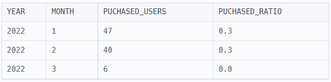 SELECT 절에서 연산을 할 때 SELECT절 서브쿼리를 써본적은 처음이다. 서브쿼리로 들어간 절은 전체 회원수를 집계해야하는 것이기 때문에 월 조건이 걸려서는 안되므로 위와 같이 쿼리를 작성하였음을 기억하자.