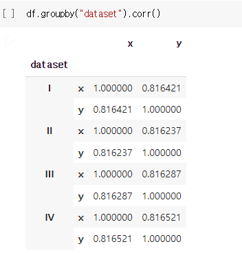 데이터 셋 나누기 및 기술통계량 추출: df.groupby("dataset")[["x", "y"]].describe()