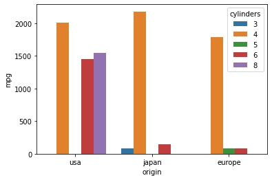 df.groupby(["origin", "cylinders"])[["mpg"]].sum()